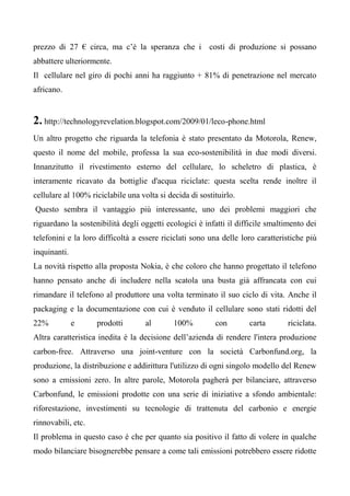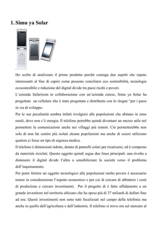 Il documento esplora vari progetti tecnologici e sostenibili, tra cui un cellulare solare per i paesi in via di sviluppo e una lavatrice ecologica che utilizza noci al posto di detersivi. Inoltre, si descrivono soluzioni come mulini a vento per rendere potabile l'acqua e caricabatterie solari portatili. L'accento è posto sull'importanza di conciliare innovazione tecnologica con eco-sostenibilità e l'approccio alla riduzione del digital divide.