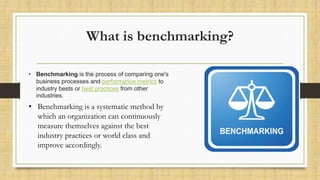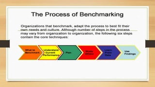 Benchmarking is comparing business processes and performance metrics to best practices from other companies or industries in order to improve. Xerox used benchmarking in the 1980s after losing market share, comparing itself to competitors like Canon and IBM. Xerox benchmarked all aspects of its business from supplier management and inventory to marketing and quality. This led to significant improvements in defects, costs, productivity and reliability, allowing Xerox to become the market leader again. Benchmarking involved planning, analysis, implementation and continuous improvement.