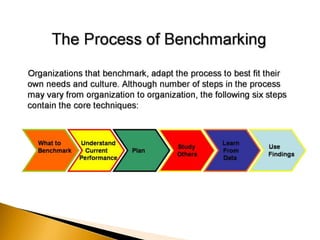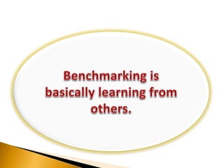 1) Benchmarking involves comparing a company's processes and performance to others to identify best practices and ways to improve.