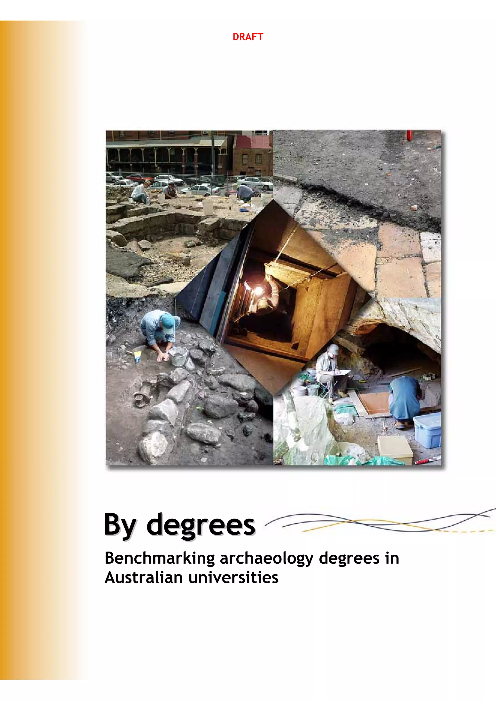 This document outlines national benchmarks for archaeology degrees in Australian universities. It was drafted by a working group representing all archaeology education providers in Australia. The benchmarks focus on expected learning outcomes for Honours degrees, which are considered the standard for professional entry. The benchmarks cover three areas: subject knowledge and understanding, archaeology-specific skills, and generic skills. Archaeology studies past human societies through their material remains. Australian archaeology makes significant global contributions and its universities provide leadership in specialized subfields. The unique Aboriginal and Torres Strait Islander archaeological record of Australia from over 50,000 years ago is also studied.
