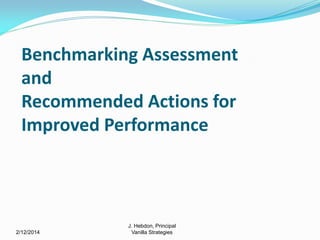 The document provides a benchmarking assessment and recommendations for improved performance from J. Hebdon, a principal at Vanilla Strategies. The assessment involved gaining perspective through questioning, observing, and reviewing work, weighing work against desired outcomes of team behavior, customer satisfaction and benchmarks against high-performing teams. Key recommendations include establishing a performance-based staffing plan, tracking critical process measures using balanced scorecard tools, and making integration and life-cycle perspectives important goals for individuals and teams.
