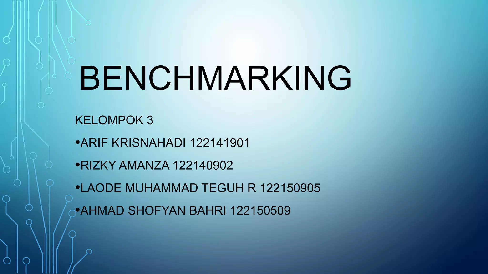 Dokumen ini membahas tentang benchmarking, termasuk definisi, keuntungan, proses, dan berbagai tipe serta aplikasinya dalam konteks perusahaan seperti Xerox. Benchmarking membantu organisasi belajar dari praktik terbaik untuk meningkatkan kinerja dan mengurangi biaya. Meskipun ada manfaat, juga terdapat risiko seperti ketidakcocokan dan informasi yang tidak akurat.