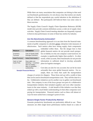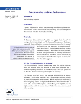 The document discusses the complexities of benchmarking in logistics performance, emphasizing the need for clear definitions and comparability of metrics. It highlights the importance of actionable data and the risks of relying on single-factor productivity metrics. Insights from industry executives point to collaborative initiatives and advanced analytical models as valuable tools for effective benchmarking and performance improvement.