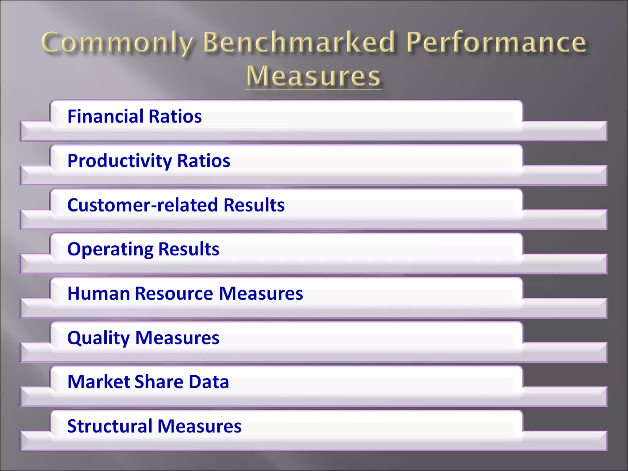 - There are four main types of benchmarking based on what is compared: product, performance, process, and strategic. Types also include internal/external and comparisons to generic, international, best-in-class, and best-of-the-best organizations.