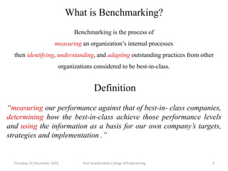 The document discusses benchmarking, which is defined as measuring an organization's internal processes and comparing them to best-in-class organizations to identify improvement opportunities. It describes benchmarking as "moving from where we are to where we want to be." Benchmarking can provide an external perspective to help set strategic targets and promote continuous performance improvements. The document outlines the benchmarking process, which includes planning, analysis, integration, action, and achieving maturity. It also discusses types of benchmarking, areas to benchmark, guidelines, advantages like continuous improvement, and disadvantages like potential resistance to copying others.