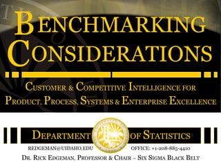 This document provides an overview of benchmarking, including definitions, types of benchmarking, benchmarking methodology, sources of information for benchmarking, benchmarking compliance considerations, and examples of performance measures that can be used for benchmarking in various areas such as customer service, products/services, business processes, support processes, employees, technology, suppliers, costs, and financial performance. Benchmarking is defined as the process of continually searching for best practices and implementing improvements to become best in class.