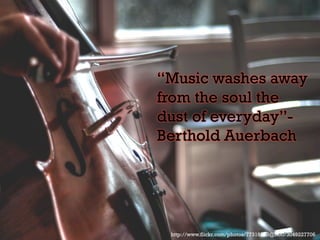 The document discusses how playing a musical instrument can help reduce stress and promote relaxation. It provides several points supporting this: playing an instrument allows the body and mind to relax; it helps gain control over stress and negative thoughts; and fosters a positive attitude. Regular practice, such as 10-15 minutes daily, can significantly improve mood and make a person feel better. Learning an instrument is recommended as a way to cope with stress and enhance overall well-being and enjoyment of life.
