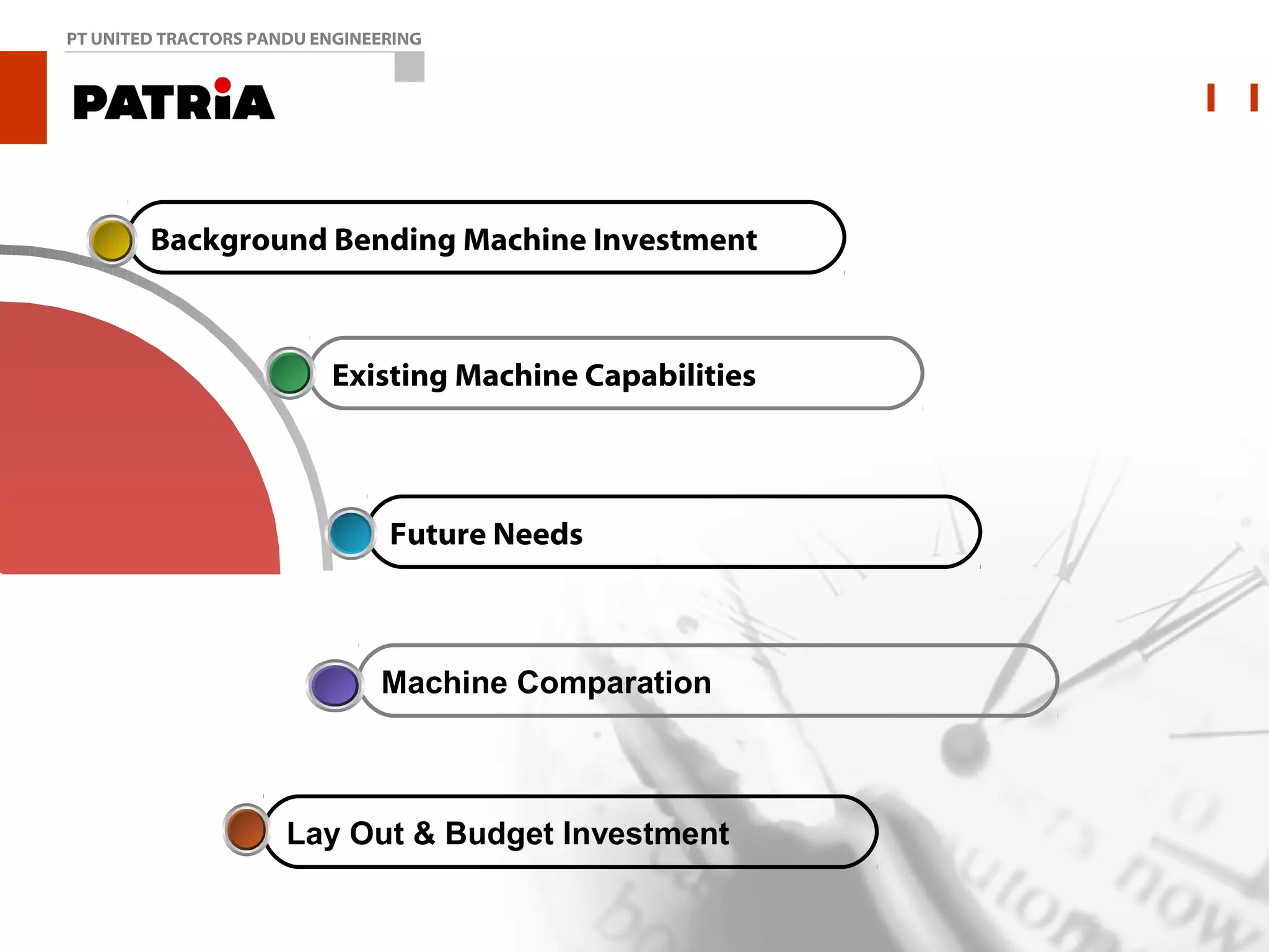 PT United Tractors Pandu Engineering is considering investing in a new bending machine. Their existing machines have high breakdown times and availability issues. A future needs analysis determined their current machines can handle upcoming workloads but investments in interchangeable punches and dies are needed. Machine comparisons showed a recommended supplier and a machine with 10000kN force and 8m length would meet their needs without needing a new machine. A proposed layout and budget was presented for punch and die modifications and other machinery investments.