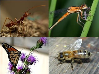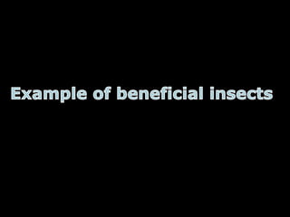 This document discusses beneficial insects and their functions. It lists several beneficial insect species, including weaver ants, green lacewings, ladybugs, and honey bees. It then describes how beneficial insects help control other insect populations through predation and parasitism. Additionally, it explains how they contribute to nutrient cycling by decomposing dead plant and animal matter. Many beneficial insects also play important roles in plant pollination, weed management, and producing commercial products like honey, silk, shellac and dyes.
