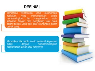 Analisis biaya-manfaat (CBA) adalah pendekatan untuk merekomendasikan kebijakan dengan membandingkan total biaya dan total manfaat dalam bentuk uang. CBA digunakan untuk membantu pengambilan keputusan publik dengan mempertimbangkan kesejahteraan masyarakat. Para praktisi teknis dan ekonom serta pemegang kebijakan terlibat dalam CBA. CBA memiliki kelebihan seperti hasil yang dapat dibandingkan dan transpar