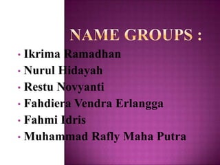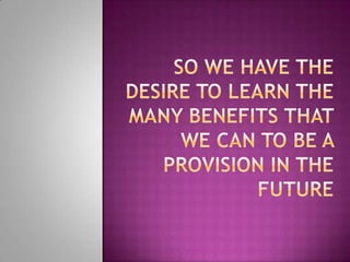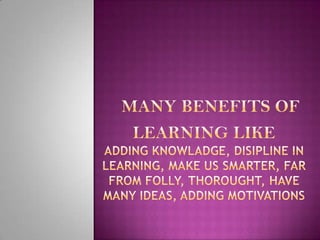 This document lists the names of several individuals and then discusses the benefits of learning. It states that learning provides extensive knowledge that is useful for experiences. It allows people to become disciplined by facilitating how they do things. Learning also adds many useful ideas and prevents people from becoming outdated or ignorant by keeping them aware of current information. It concludes that gathering many ideas from learning can motivate people and help knowledge grow within themselves.