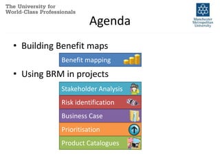 The document discusses benefit realisation management (BRM) and how it can be used in projects. It describes how to build benefit maps by identifying objectives, supporting benefits, and activities that deliver benefits. Benefit maps can then be used for stakeholder analysis, risk identification, building business cases, prioritization, and developing product catalogues. Prioritization techniques include a simpler approach of assessing which activities enable the most benefits, and a more complex weighted scoring approach. The document provides examples of each technique.