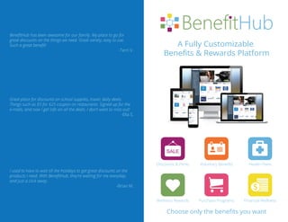 BenefitHub is a customizable benefits and rewards platform that allows employers to choose from a variety of benefits for their employees including financial wellness programs, purchase programs, wellness incentives, health plans, voluntary benefits, and discounts. The platform had a 72% participation rate among clients in 2014. It offers exclusive discounts, cash back rewards, and interest-free purchase financing to help employees save thousands on items like cars, electronics, travel and more. Employers can launch the program, track utilization and engagement through comprehensive reporting tools.