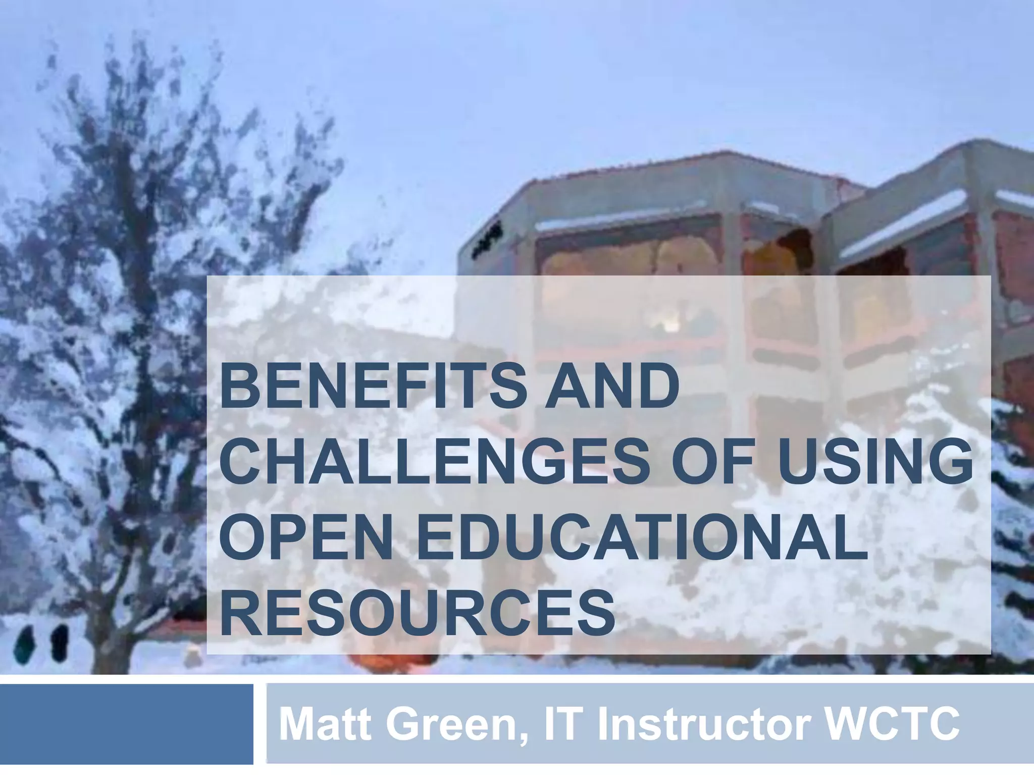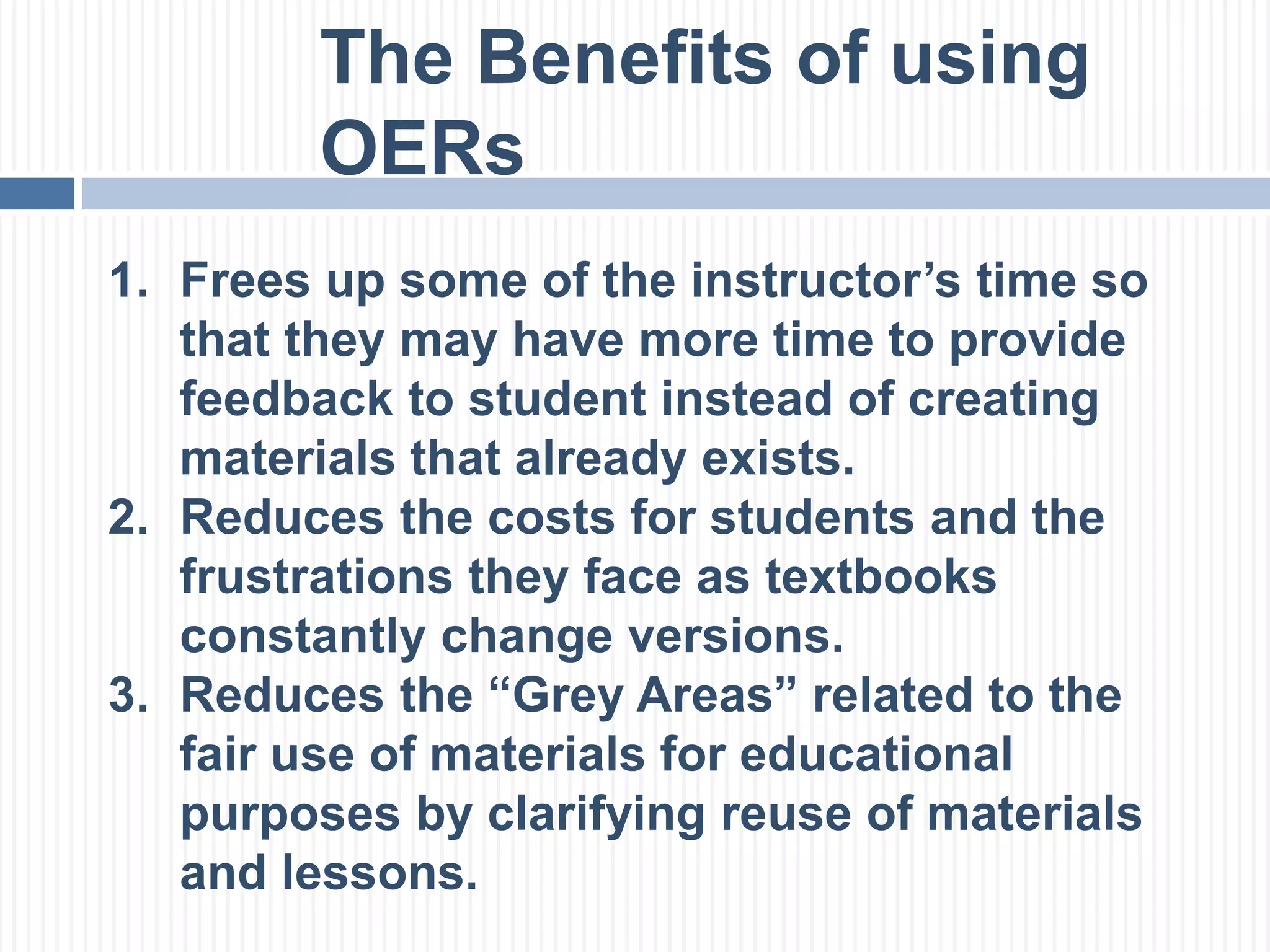 Open educational resources (OERs) provide several benefits but also some challenges for instructors. The benefits include freeing up instructor time for student feedback, reducing student costs and frustration from changing textbooks, and clarifying fair use of materials. However, challenges include student perception that free resources are inferior, keeping topics up-to-date, lack of editing and review compared to textbooks, and lack of motivation or incentive for faculty to develop OERs due to limited compensation. Integration of OERs with learning management systems is also limited.