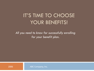 The document provides information for employees on enrolling for benefits during the open enrollment period from October 1 to November 15. It states that employees must complete a hospital enrollment form by November 15 for health insurance to be effective January 1, 2007. It also notes that employees must complete a flexible spending plan form each year and that dental insurance will continue as is unless an employee requests a change from HR. Finally, it mentions that after November 15, changes can only be made within 30 days of a qualifying event and provides contact information for the HR benefits representative.
