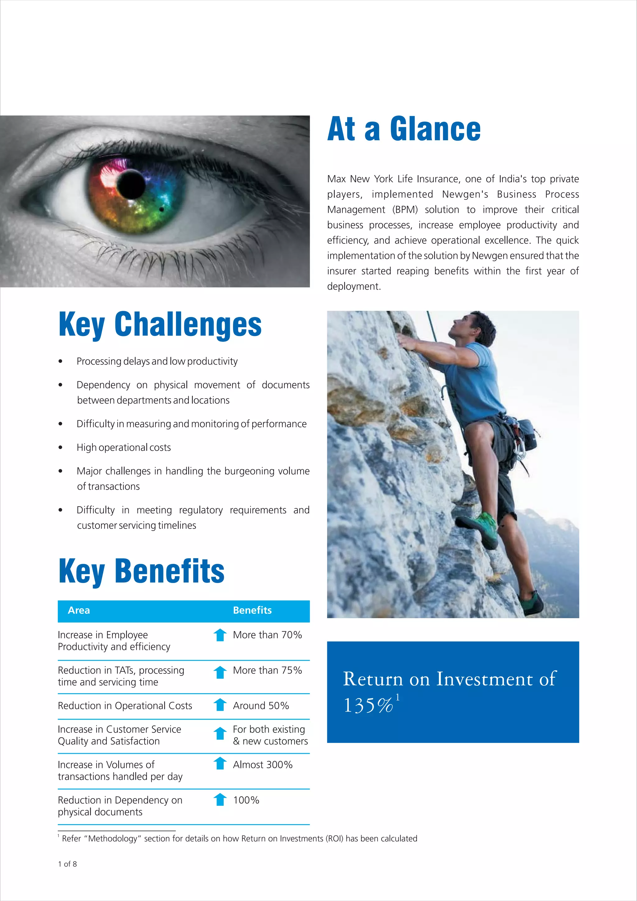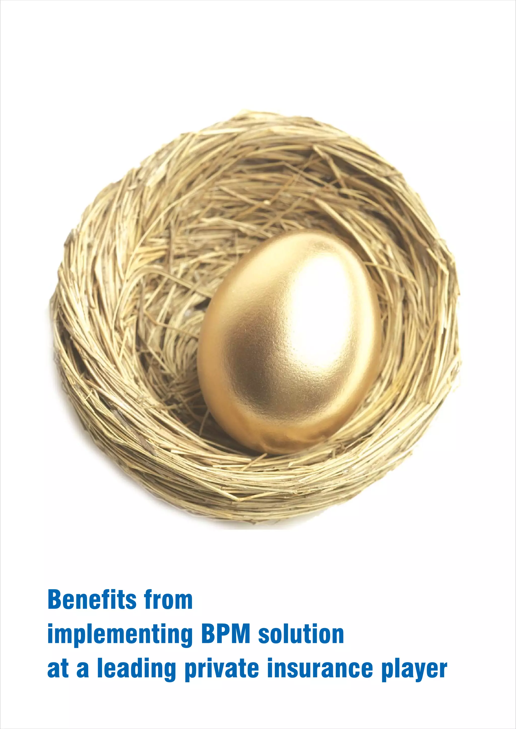 This document discusses how a leading private insurance company implemented a Business Process Management (BPM) solution from Newgen to improve critical business processes, increase employee productivity and efficiency, and achieve operational excellence. The solution helped reduce turnaround times, processing times, and operational costs by over 50-75% while increasing employee productivity by over 70% and volumes handled by almost 300%. It provided benefits like a 135% return on investment and improved customer service quality and satisfaction. The solution automated processes like new business and policy owner servicing across 37 locations.