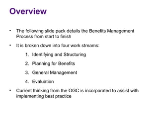 The document outlines the benefits management process, which includes four work streams: 1) identifying and structuring benefits, 2) planning for benefits, 3) general management, and 4) evaluation. It provides details on the key activities and objectives within each work stream, such as identifying stakeholders, benefit owners, dependency modeling, and tracking and measurement. The process is meant to guide organizations in successfully implementing benefits management best practices.