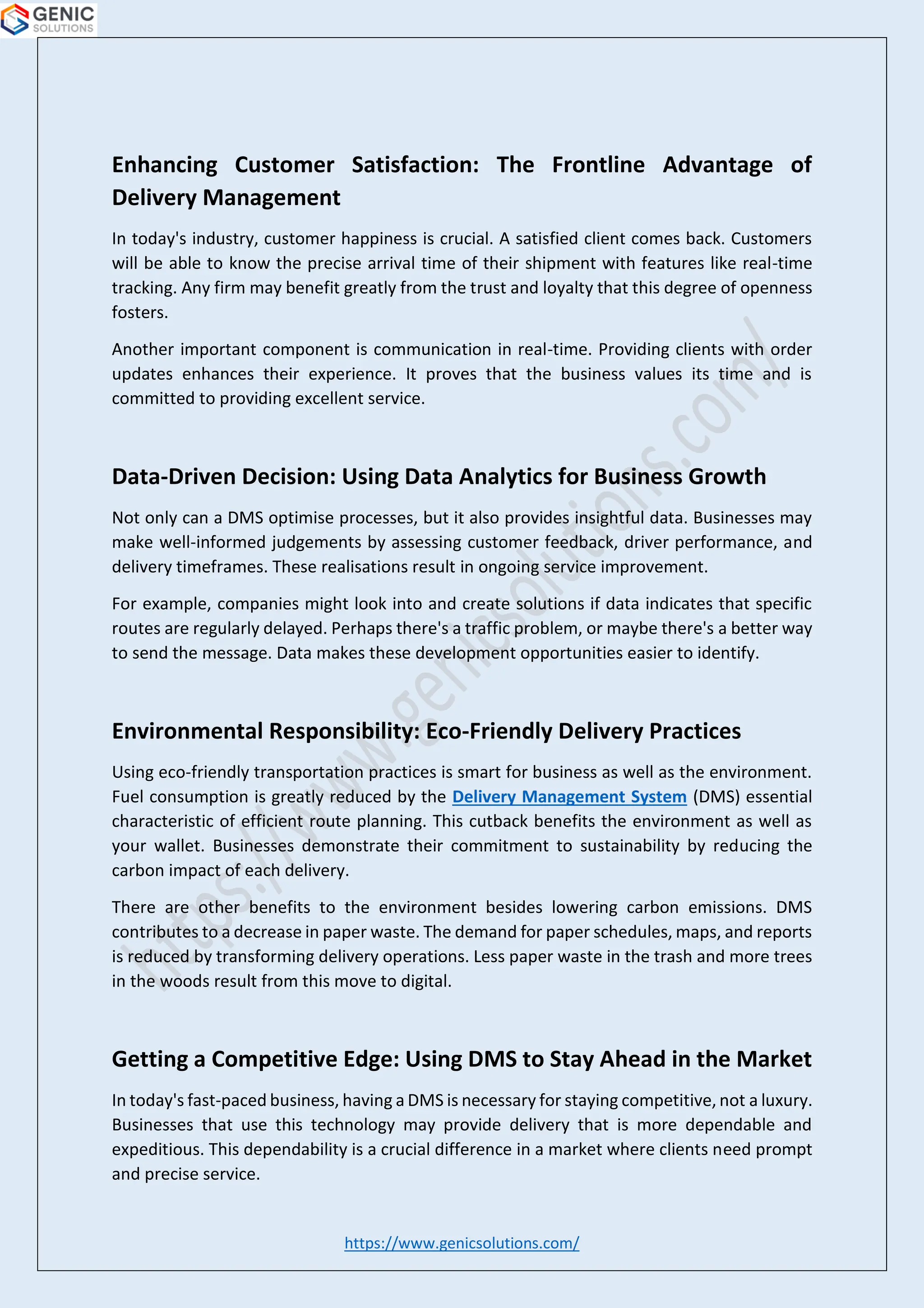 The document discusses the transformative impact of comprehensive delivery management systems (DMS) on business efficiency, customer satisfaction, and cost-effectiveness. It highlights benefits such as streamlined operations, real-time tracking, data analytics for informed decision-making, and environmental responsibility through optimized routes. Additionally, it emphasizes the importance of DMS in maintaining regulatory compliance, managing inventory, and enhancing workforce performance, while also exploring future trends in technology like AI and IoT.