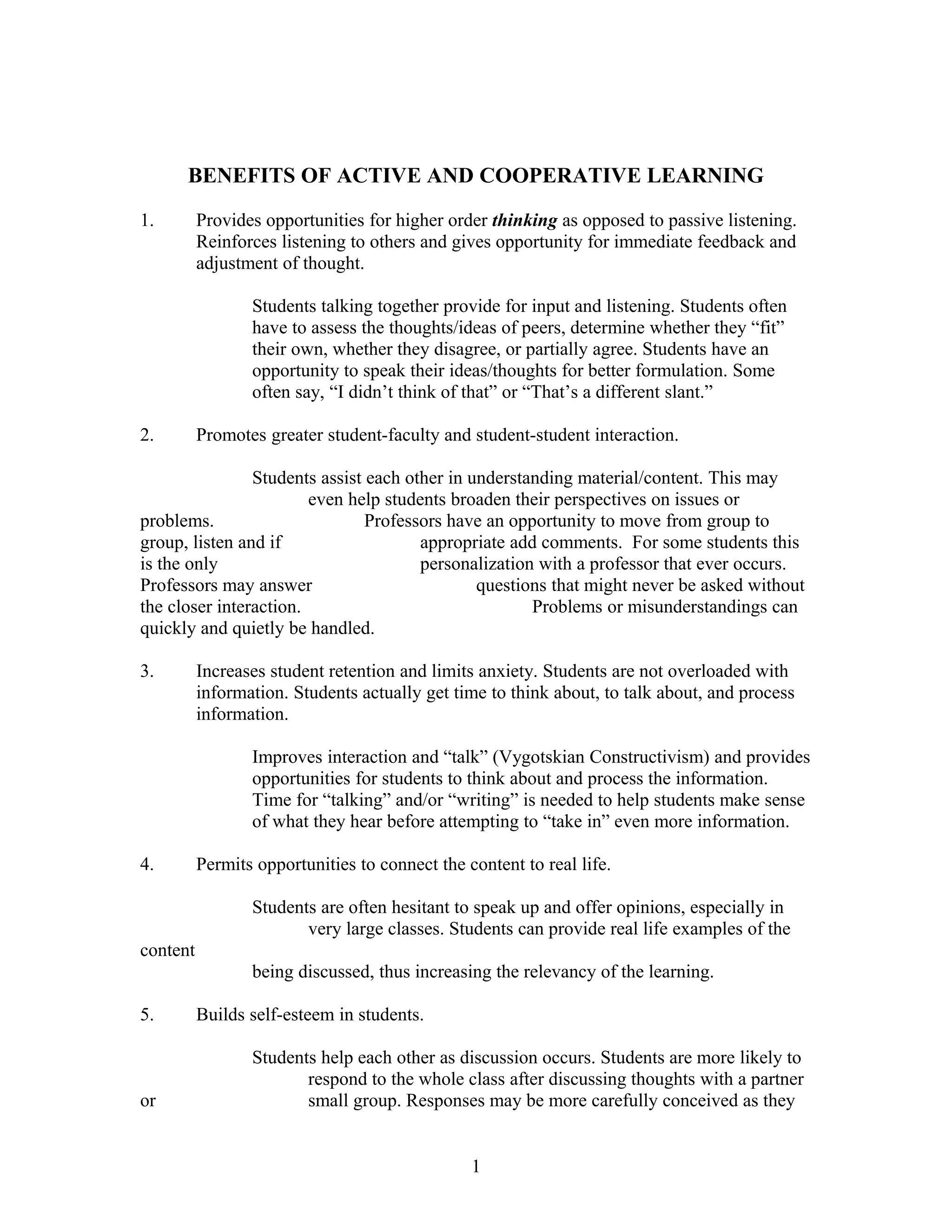 1. Active and cooperative learning provides opportunities for higher-order thinking and greater interaction among students and faculty. It allows students to discuss and process information in small groups.