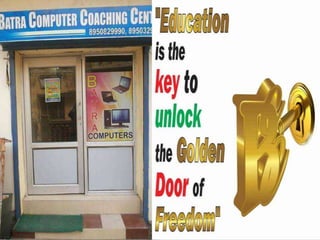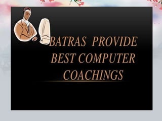 The document outlines the significance of computer training, emphasizing its role in improving employability and productivity for both job seekers and companies. It describes various aspects of computers, including input and output devices, and compares desktops and laptops in terms of cost, portability, and repair. Additionally, it provides an overview of available courses at the Batra Computer Centre, encompassing programming, web development, and basic computer skills training.