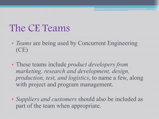 Concurrent engineering can decrease time to market and increase productivity through faster product development, better quality, and fewer engineering changes. It uses cross-functional teams that include members from marketing, R&D, design, production, and more to concurrently design products. For concurrent engineering to be effective, team members must prioritize the project over their individual departments through improved interdepartmental collaboration.
