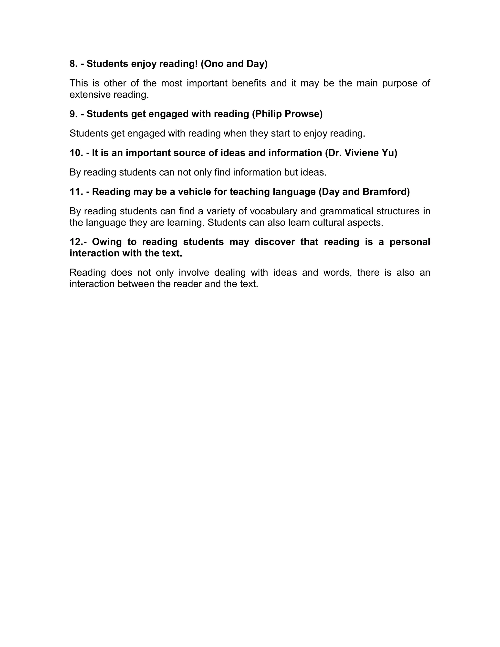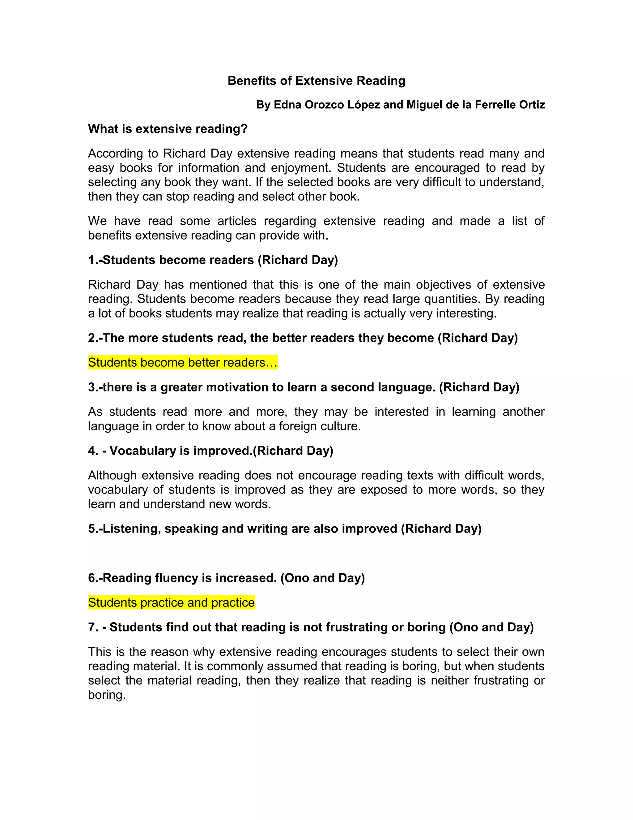 Extensive reading provides numerous benefits according to research. It allows students to become readers by reading large quantities of easy books that they select themselves. As students read more, they become better readers with improved vocabulary, listening, speaking and writing skills. Reading fluency increases as students practice reading texts they enjoy. Students also find reading to be an engaging experience that is informative rather than frustrating when they can choose their own reading materials.