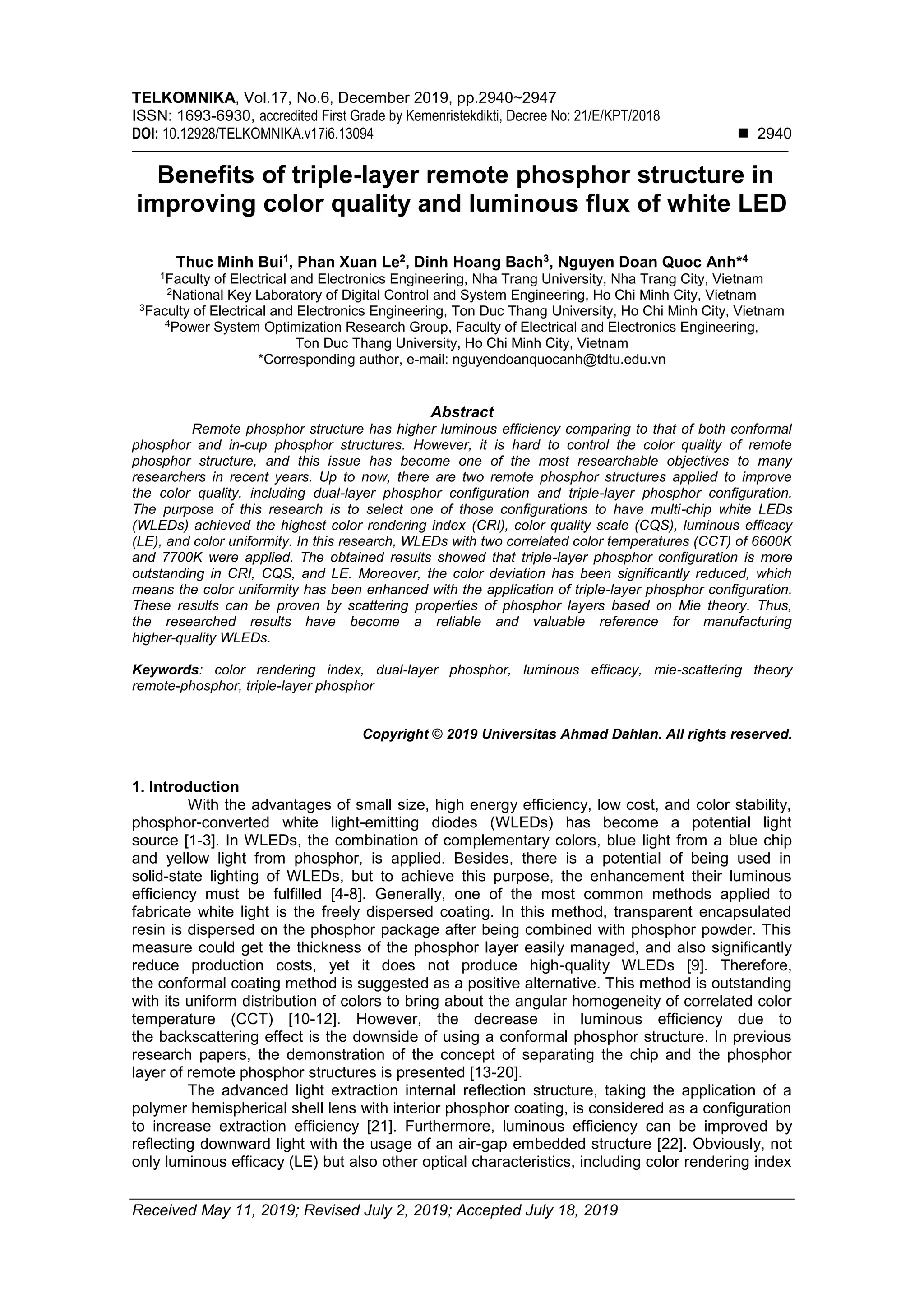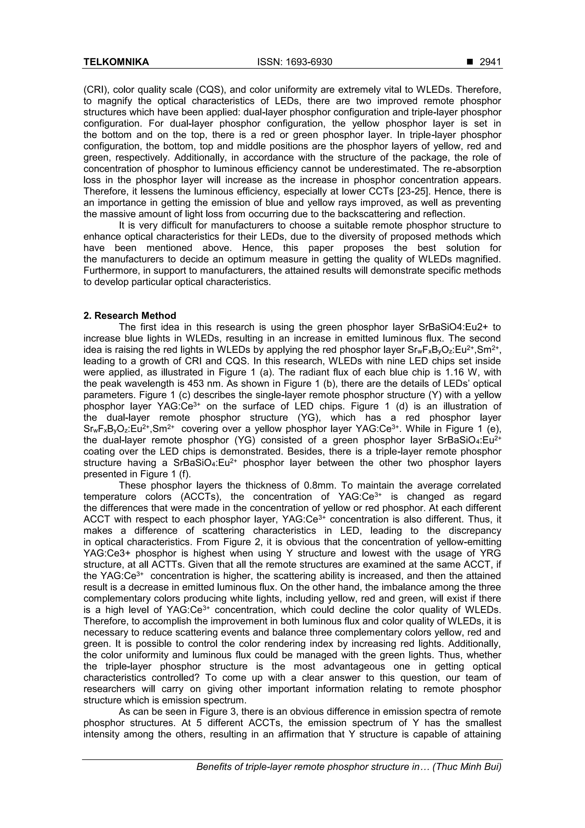 This document discusses the benefits of using a triple-layer remote phosphor structure to improve the color quality and luminous flux of white LEDs. It compares single-layer, dual-layer, and triple-layer phosphor configurations. The results show that the triple-layer structure is most effective at improving the color rendering index, color quality scale, and luminous efficacy. By separating the phosphor layers into yellow, red, and green, the triple-layer structure better balances the complementary colors and reduces light re-absorption losses compared to other structures. The enhanced optical performance of the triple-layer structure can be explained by Mie scattering theory and how it applies to the phosphor particle distributions in each layer. Overall,