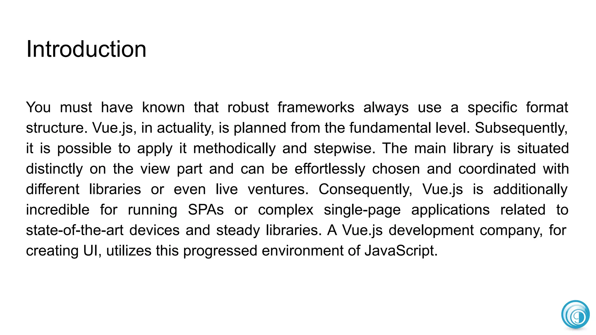 Vue.js is a lightweight and flexible JavaScript framework ideal for developing single-page applications and complex user interfaces due to its easy integration capabilities and robust features like Vuex and Vue Router. It offers rapid development, scalability, and a strong focus on data security, making it suitable for both small and large projects while providing better performance and user experience compared to heavier frameworks like Angular. Additionally, Vue.js is open-source and allows for straightforward expansion and customization according to specific project needs.