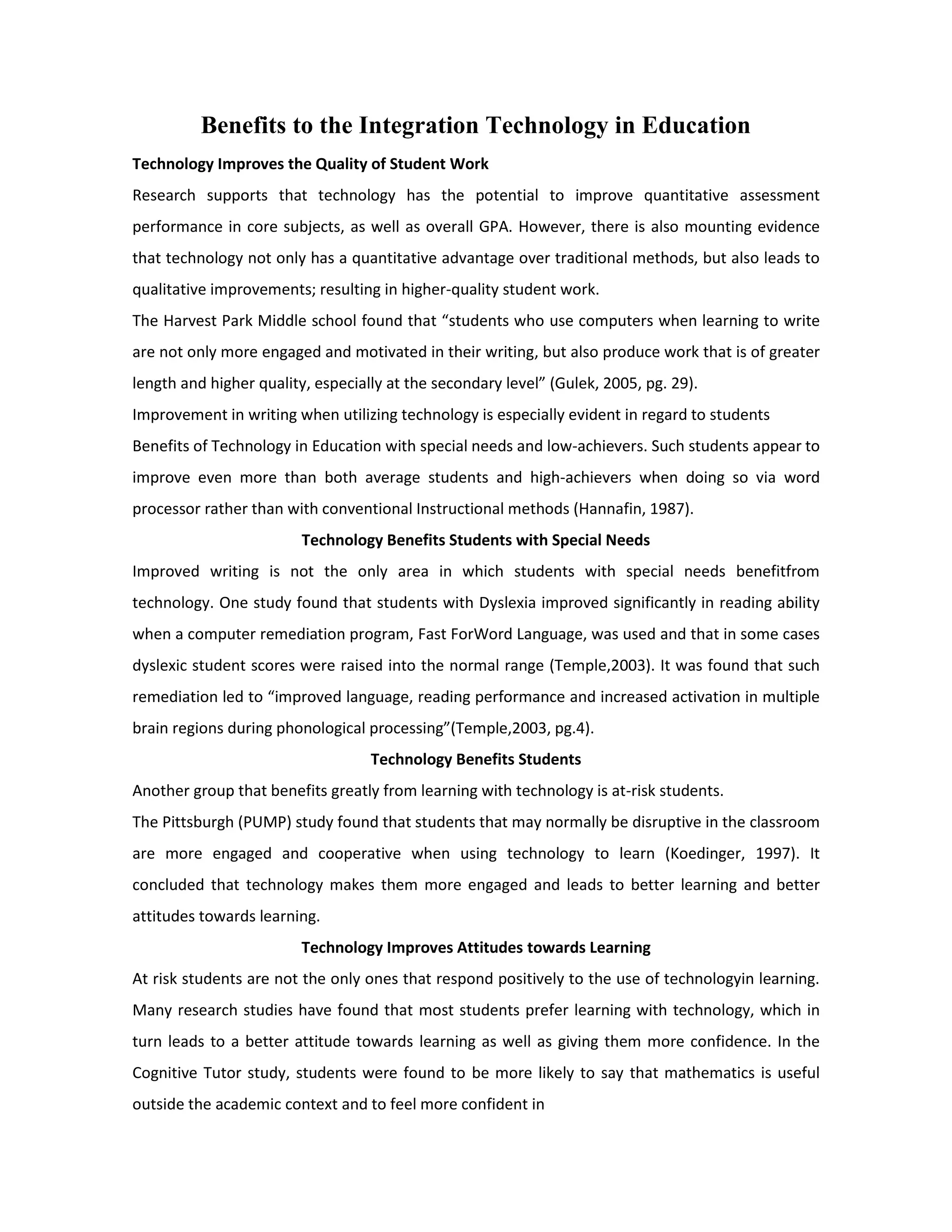 1) Research shows that technology leads to higher quality student work, better writing, and higher GPAs compared to traditional methods.