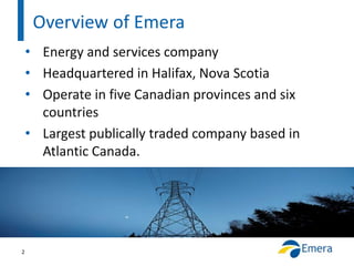 This document outlines Emera's mental health strategy to promote recovery in the workplace. Emera is an energy and services company headquartered in Nova Scotia with over 3,700 employees across Canada, the US and the Caribbean. A business case developed in 2012 showed rising costs from mental health-related long-term disability claims and drug benefits, as well as decreasing employee commitment and increasing EFAP usage. In response, Emera developed a multi-year mental health strategy starting in 2013 focused on awareness, stigma reduction, and supporting employees navigating healthcare services or staying at or returning to work. The strategy also measures participation and seeks feedback to promote coping skills, early detection, and self-assessment tools.