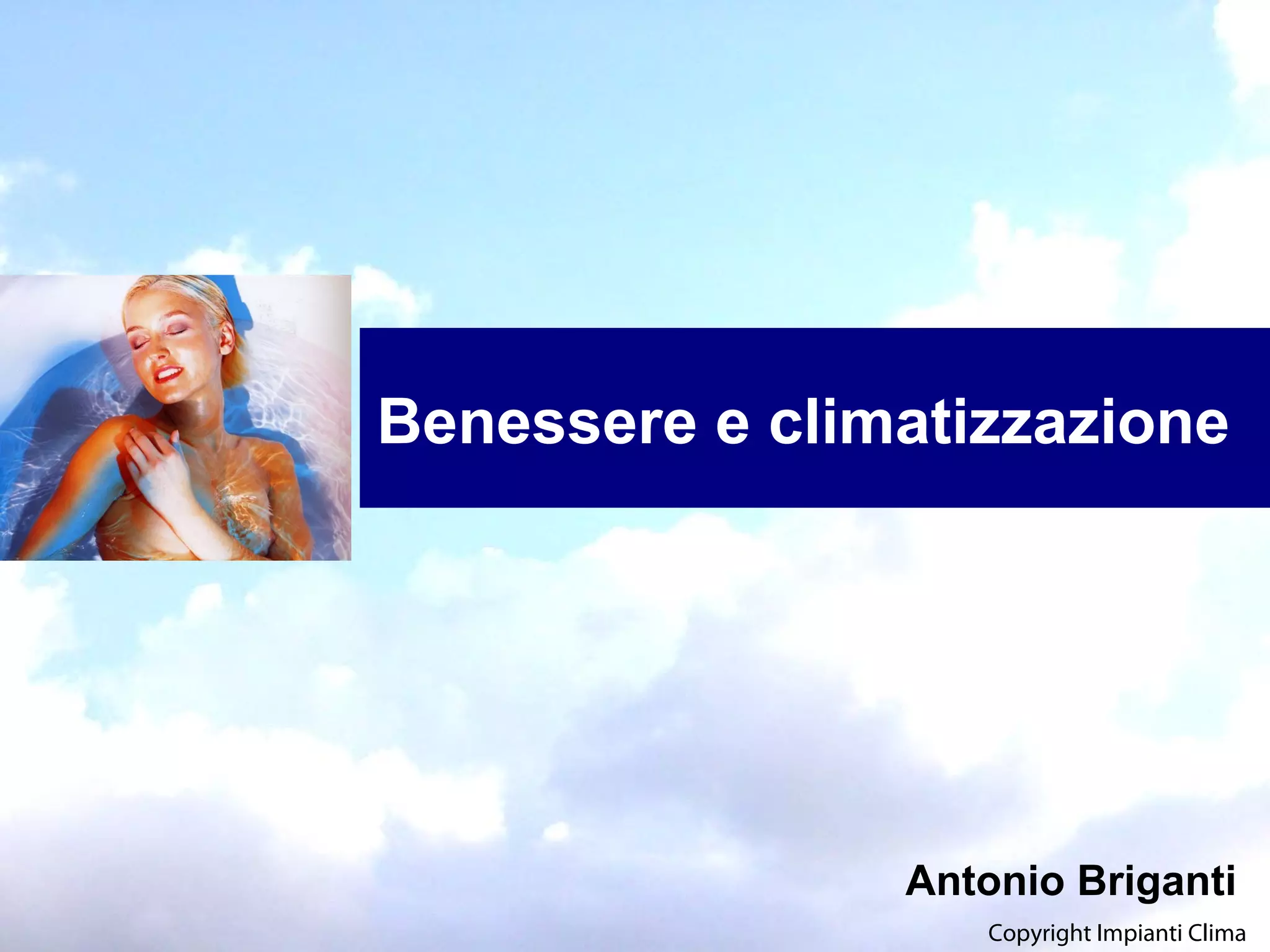 Il documento discute il benessere termoigrometrico e l'importanza della climatizzazione nel creare condizioni ambientali confortevoli, controllando temperatura, umidità e qualità dell'aria. Si analizzano concetti fondamentali come umidità assoluta e relativa, calore sensibile e latente, e il ruolo della convezione, evaporazione e radiazione nel trasferimento di calore. Viene infine delineata la zona di benessere con parametri specifici per temperature e velocità dell'aria in ambienti civili.