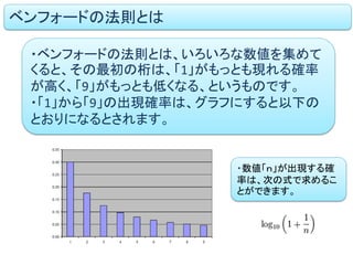 ベンフォードの法則とは ・ベンフォードの法則とは、いろいろな数値を集めて くると、その最初の桁は、「1」がもっとも現れる確率 が高く、「9」がもっとも低くなる、というものです。 ・「1」から「9」の出現確率は、グラフにすると以下の とおりになるとされます。 ・数値「n」が出現する確 率は、次の式で求めるこ とができます。