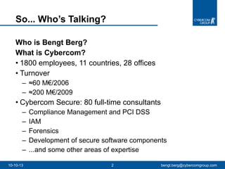 Bengt Berg is the Head of Compliance Management Services at Cybercom Sweden East AB, an IT security company with 1800 employees. He discusses how external compliance requirements like PCI DSS, ISO 27001, and others have transformed security practices. PCI DSS in particular drove changes where software developers now focus on security and retailers leverage security investments across their companies. Compliance portals, issue management systems, and wikis have emerged as popular tools for managing compliance documentation and requirements.