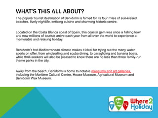 Benidorm, located on Spain's Costa Blanca, is a popular tourist destination known for its beaches, vibrant nightlife, and various attractions such as theme parks and museums. The city offers a Mediterranean climate ideal for outdoor activities, with average summer temperatures reaching 28°C and a range of attractions catering to families, couples, and nightlife enthusiasts. Visitors can enjoy the charm of the historic old town, animal parks like Mundomar, and the water park Aqualandia, making Benidorm suitable for a wide array of holiday experiences.