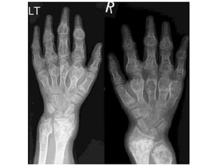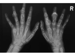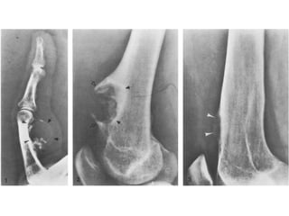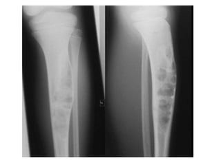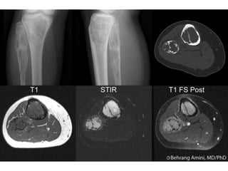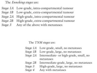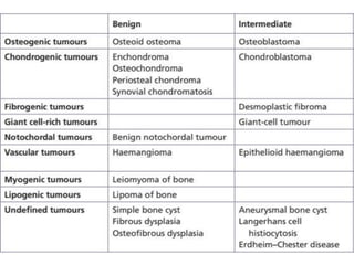 This document summarizes several types of benign bone tumors and tumor-like conditions. It describes the characteristics, presentation, diagnosis and treatment for conditions such as osteoid osteoma, enchondroma, osteochondroma, peristeal chondroma, haemangioma of bone, simple bone cyst, and fibrous dysplasia. These lesions are generally classified based on their ability to invade surrounding tissue or spread elsewhere in the body, with benign lesions not invading or spreading, intermediate lesions potentially destroying bone and recurring, and rare intermediate lesions having a potential to metastasize. Diagnosis involves imaging such as x-ray, CT, MRI and biopsy. Treatment ranges from observation to surgical resection depending on symptoms, risk of fracture