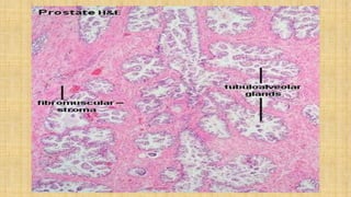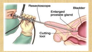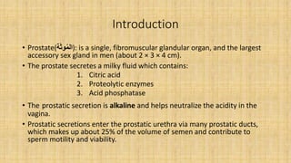 The prostate gland secretes fluid that nourishes and protects sperm. It normally enlarges with age due to a balance between cell growth and death being disrupted. The main cause of enlargement is benign prostatic hyperplasia (BPH), where cells multiply faster than they die. BPH symptoms include frequent urination and weak urine stream. Diagnosis involves exams and ruling out other causes. Mild cases are treated with lifestyle changes while moderate-severe cases may require medicines or surgery like transurethral resection of the prostate (TURP).