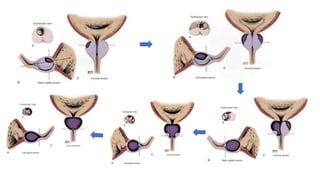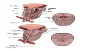 This document discusses the management of benign prostatic hyperplasia (BPH). It begins with the anatomy and blood supply of the prostate gland. It then describes BPH, including the pathology and common lower urinary tract symptoms. Diagnosis involves medical history, physical exam including digital rectal exam and tests like PSA, ultrasound and urodynamic studies. Treatment options discussed include watchful waiting, pharmacological treatments like alpha blockers and 5-alpha reductase inhibitors, and surgical options ranging from minimally invasive procedures like transurethral resection of the prostate to more invasive open prostatectomy. Complications of treatments like TURP are also reviewed.
