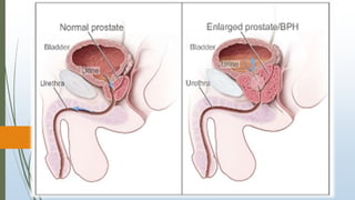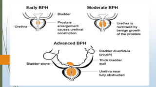 Benign prostatic hyperplasia (BPH) is a noncancerous enlargement of the prostate gland that is common in aging men. BPH occurs when the prostate gland grows larger and squeezes the urethra, causing problems with urination. Symptoms include difficulty starting or stopping urination and frequent urination, especially at night. Treatment options depend on symptom severity and include medications to shrink the prostate or relieve symptoms, minimally invasive procedures such as transurethral resection of the prostate, and surgery for severe cases. Potential complications of treatment include retrograde ejaculation and temporary difficulty urinating.