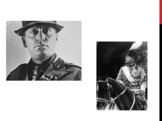 Benito Mussolini rose to power in Italy in the early 20th century by establishing fascism. He created a totalitarian fascist regime and allied with Nazi Germany. However, his support of Germany led to Italy's defeat in World War 2. Mussolini was eventually arrested and killed by Italian partisans in 1945, marking the fall of his fascist regime.