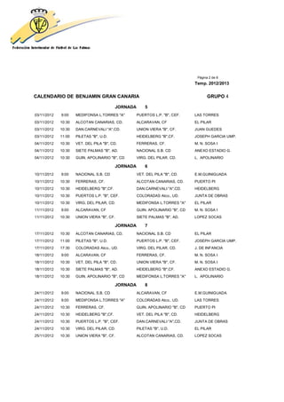 This document contains the schedule for the Benjamin Gran Canaria youth football group 4 for the 2012-2013 season. It lists the dates, times, home and away teams for 13 rounds of matches played between October 2012 and December 2012. The matches are divided into rounds (jornadas) with multiple games scheduled each date at different home fields. The home teams' fields are included for each match.