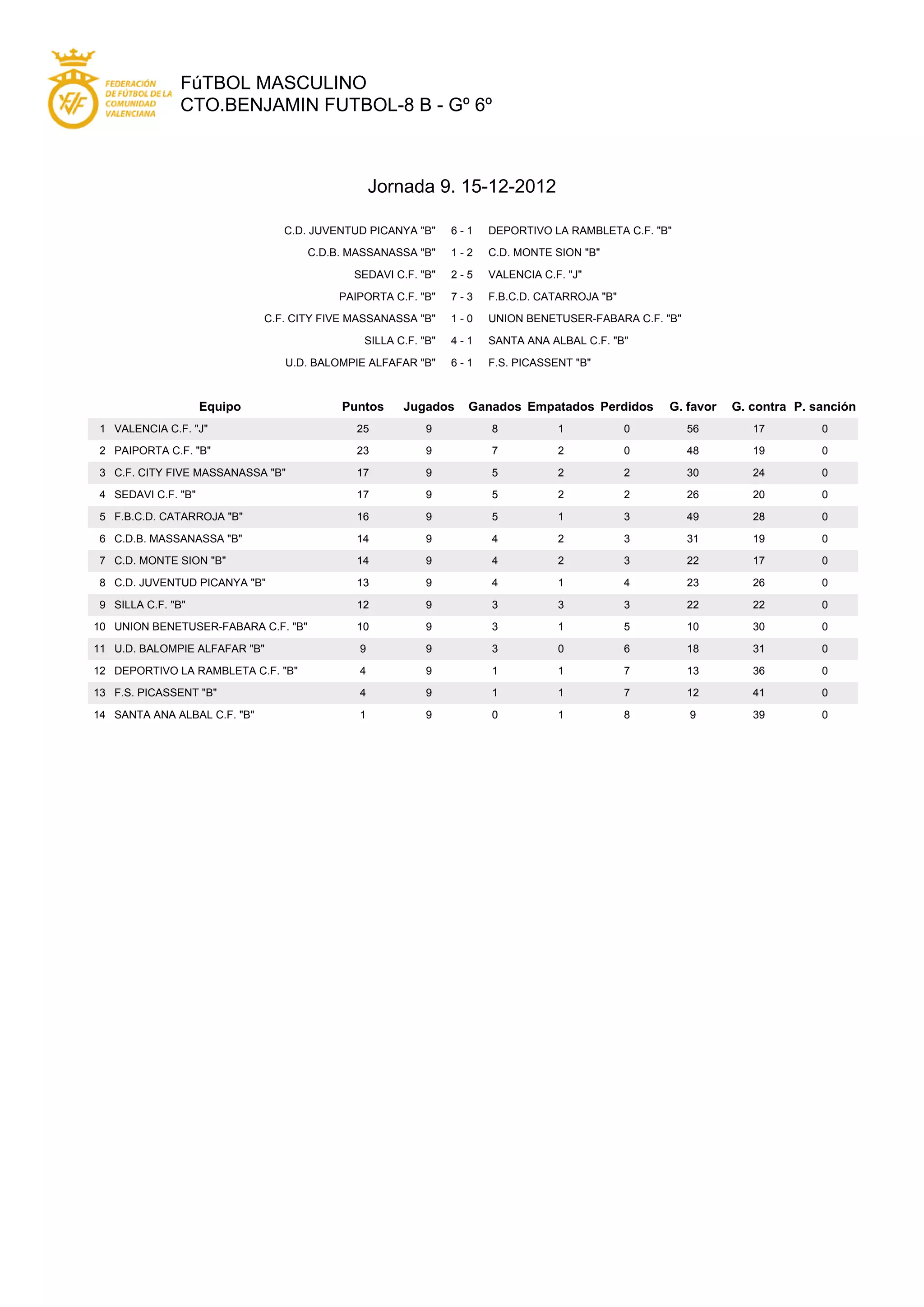This document summarizes the results of the 9th round of matches in the men's football league CTO.BENJAMIN FUTBOL-8 B - Go 6o. It lists the scores of 7 matches played and the current league table showing points, games played, won, drawn, lost and goals for each of the 14 participating teams. Valencia C.F. "J" leads the table with 25 points from 8 wins, 1 draw and no losses.