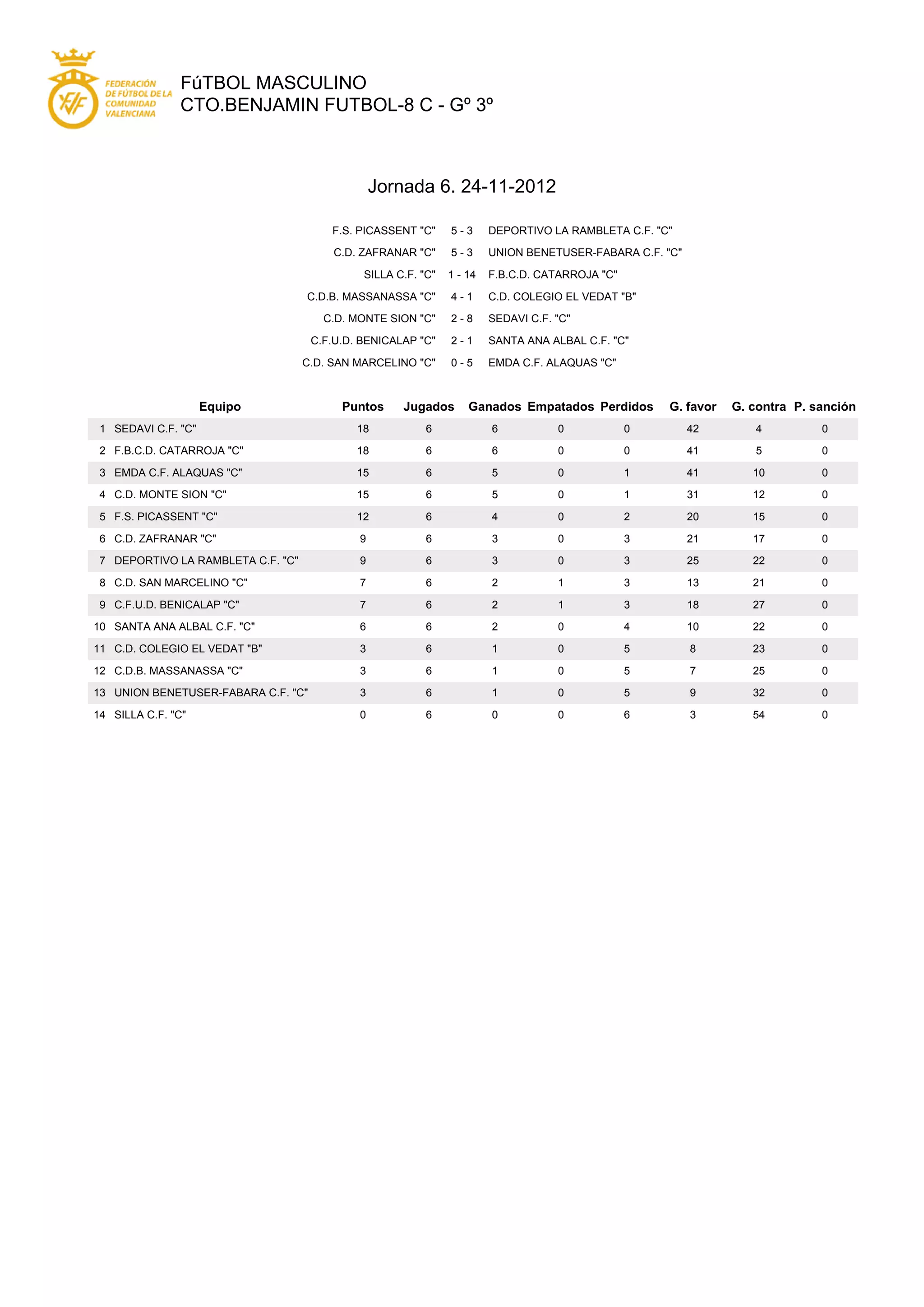 This document summarizes the results of the 6th matchday of the men's football league CTO.BENJAMIN FUTBOL-8 C. It provides the scores of the 7 matches played, as well as the current league table showing points, games played, won, drawn, lost, goals for, against, and penalties for each of the 14 teams. SEDAVI C.F. "C" and F.B.C.D. CATARROJA "C" are leading the league with 18 points each from their 6 games.