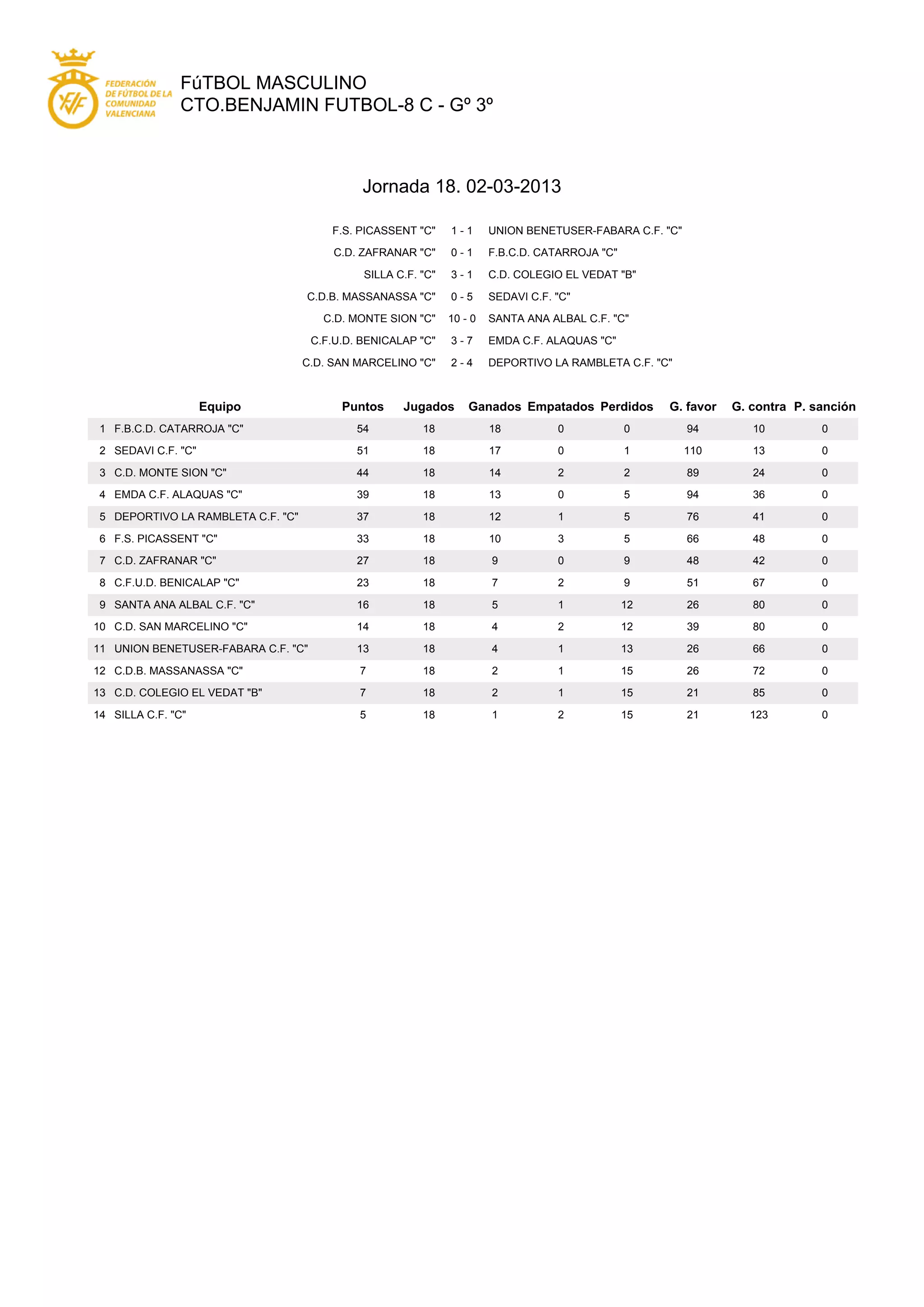 The document summarizes the results of the 18th matchday of the men's football league CTO.BENJAMIN FUTBOL-8 C - Go 3o. It provides the scores of 7 matches played. It also includes a table with the current league standings showing the points, games played, won, drawn, lost, goals for, goals against and penalties of each of the 14 participating teams. F.B.C.D. CATARROJA "C" is leading the standings with 54 points followed by SEDAVI C.F. "C" with 51 points and C.D. MONTE SION "C" with 44 points.