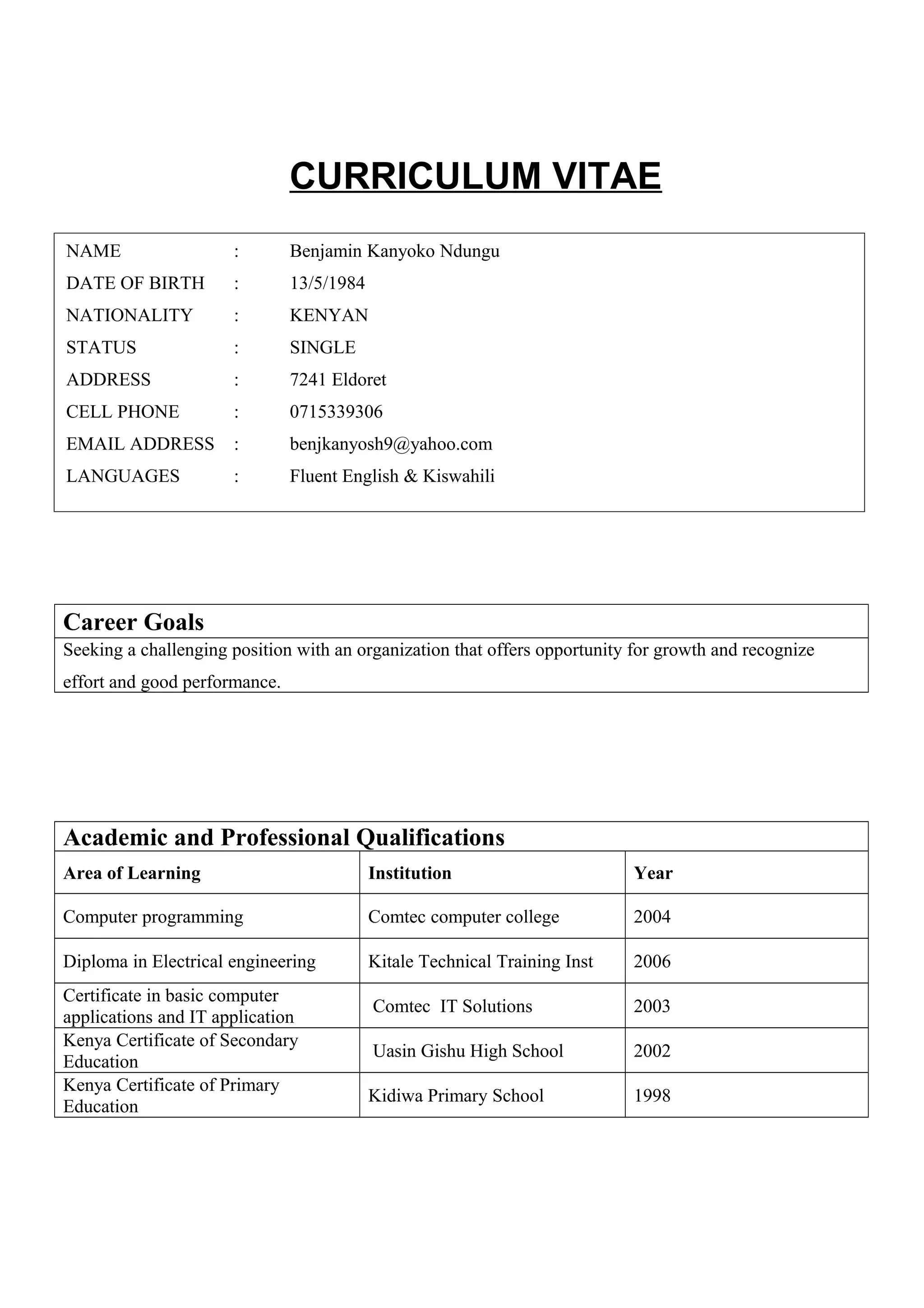 This curriculum vitae is for Benjamin Kanyoko Ndungu, seeking a challenging position with opportunity for growth. He has a diploma in electrical engineering from Kitale Technical Training Institute and certificates in computer programming and applications. His personal attributes include professionalism, honesty, being hardworking and able to meet deadlines. He has technical experience in languages like C, C++, Java and platforms like Windows and Linux. His hobbies include reading, camping, music and volunteering.