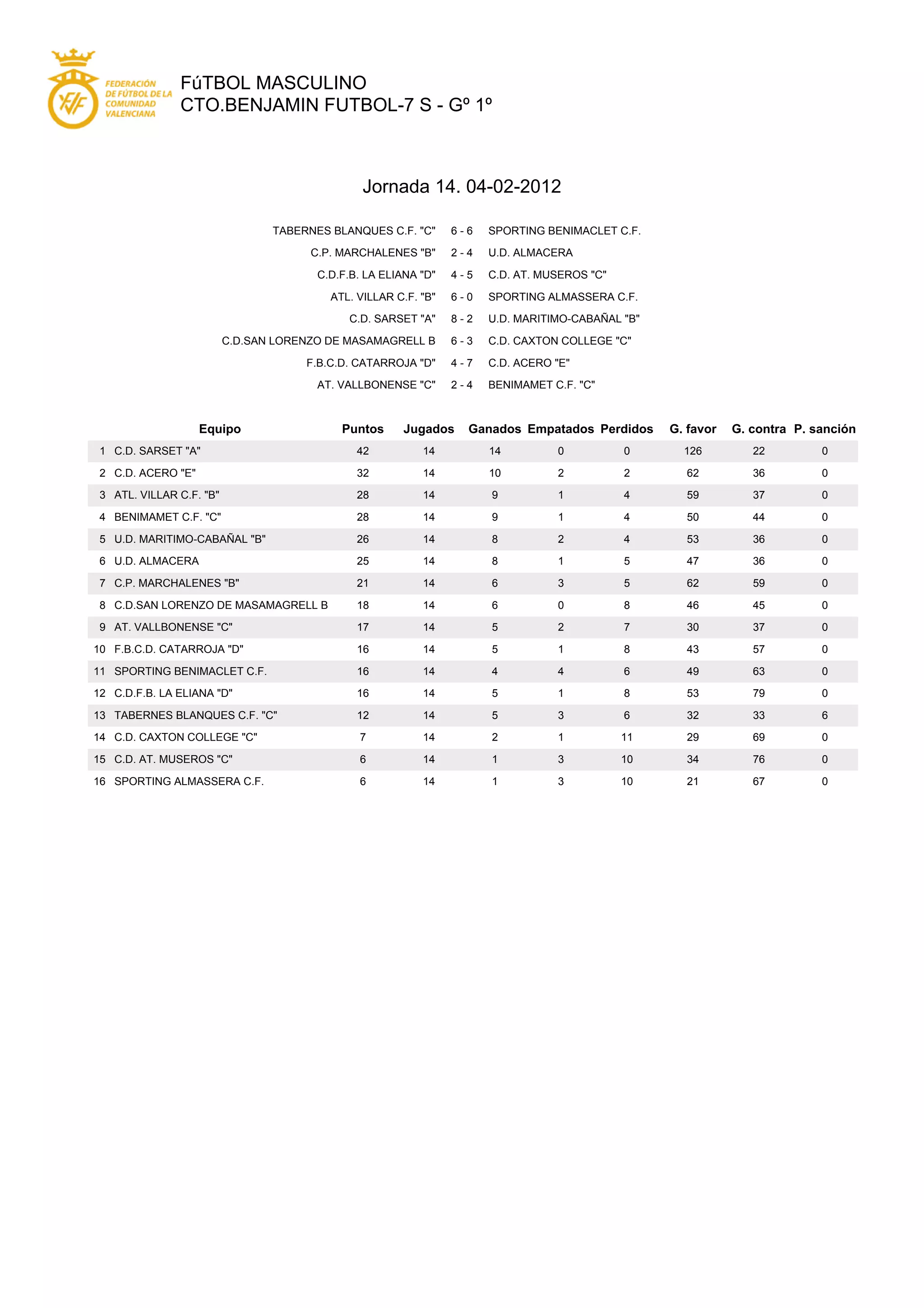 The document summarizes the results of the 14th matchday of the men's football league CTO.BENJAMIN FUTBOL-7 S - Go 1o. CD SARSET "A" is in first place with 14 wins and 0 losses. CD ACERO "E" is in second with 10 wins, 2 draws and 2 losses. ATL. VILLAR C.F. "B" is in third with 9 wins, 1 draw and 4 losses.