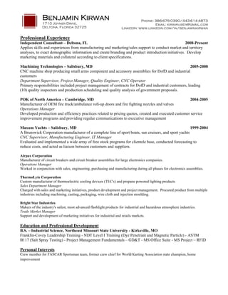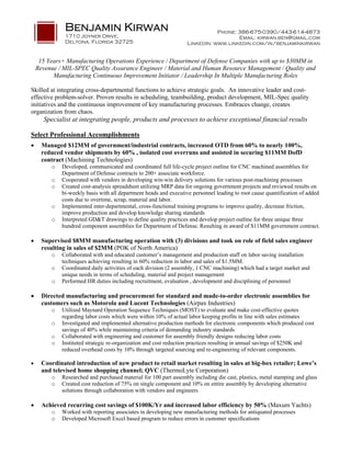 Benjamin Kirwan has over 15 years of experience in manufacturing operations and leadership roles for Department of Defense companies. He has a proven track record of improving quality, reducing costs, and increasing efficiency. Kirwan is skilled at integrating functions to achieve strategic goals and creating organization from chaos. He has managed multi-million dollar operations and secured large government contracts.