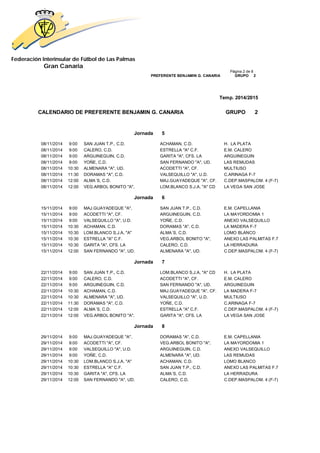 This document contains the calendar for the 2014/2015 season of the Preferente Benjamin G. Canary Islands Group 2 football league. It lists the dates, times and locations of 12 matchdays and all the pairings between the participating teams. Some key details are the matches will take place on Saturdays and the locations include fields in municipalities like Arguineguín, Maspalomas and San Fernando.