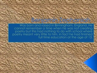 Benjamín Zephaniah is a poet from Birmingham, England who could not remember a time when he was not creating poetry, though he had little interest in it in school. He left formal education at age 13 but went on to inspire many young writers and rappers with his accessible work. Some of his well-known songs include "History," "Progress," and poems about religious war, gangsters, and political events like the Tiananmen Square protests.