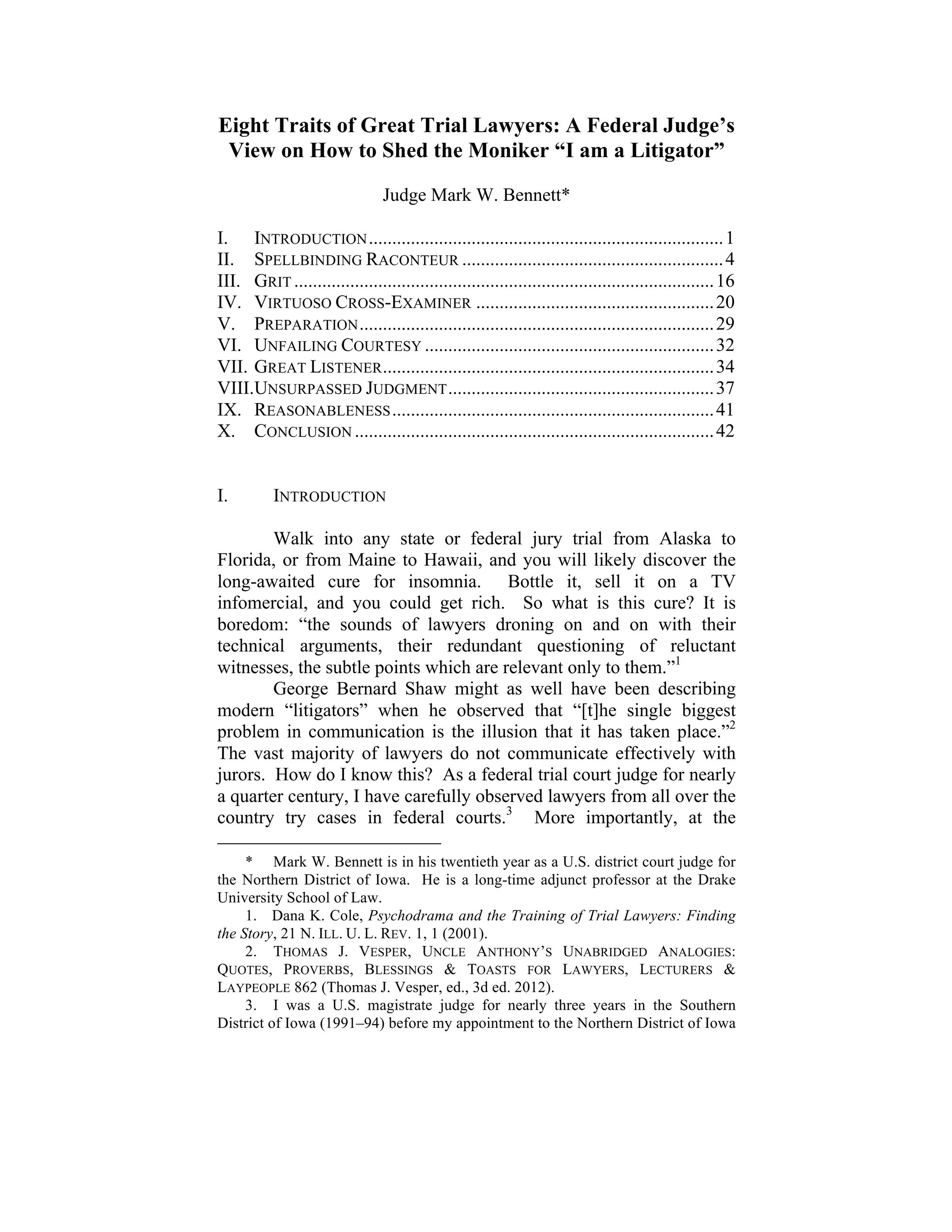 This document discusses eight traits of great trial lawyers based on the observations of a federal trial court judge with over 20 years of experience. The judge identifies spellbinding storytelling skills as the most important trait, noting that all great trial lawyers are great storytellers. However, the judge observes that storytelling is a dying art among lawyers. The judge explores possible reasons for this, including lack of experience among most law professors. The judge hopes that by identifying these key traits, lawyers can work to improve their skills and become feared and admired trial attorneys.