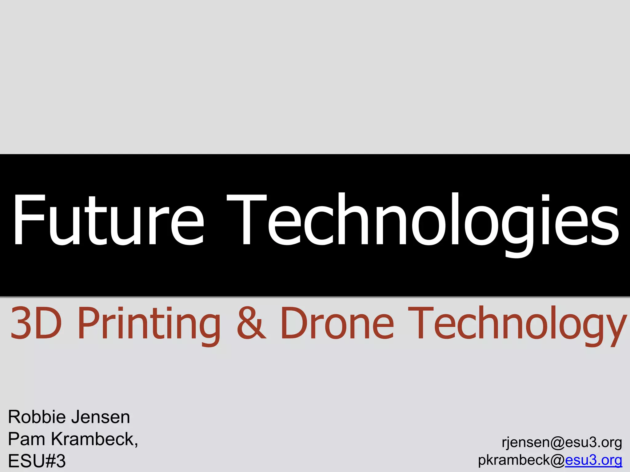 This document discusses 3D printing and drone technology for educational purposes. It provides information on affordable 3D printers under $3,000 and 3D printing software and websites for creating plans. Examples are given of a 3D printed ear and using 3D printers across curriculums. For drones, examples are given of their uses in agriculture, construction, and ice monitoring. Legal regulations and guidelines for drones are discussed. The document prompts groups to brainstorm ideas for incorporating 3D printing and drone technology into their own curriculums and lessons.